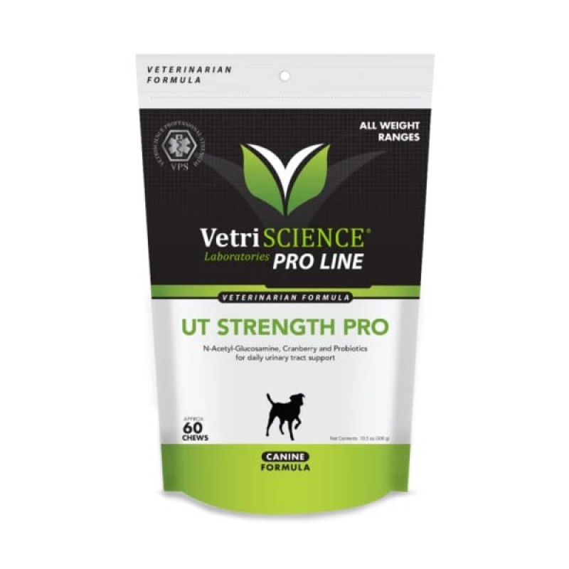 VETRISCIENCE UT Strength PRO 犬用尿道保健咀嚼片是一種支持狗狗尿道健康的配方。這款狗泌尿保健咀嚼片可以長期用於容易出現泌尿道問題或結晶的狗隻。 VETRISCIENCE UT Strength PRO 含有 D-甘露糖,這是一種天然單醣,有助於消除有害細菌。此外,還含有 N-乙酰氨基葡萄糖 (NAG),這是生成糖蛋白的重要成分。泌尿道粘膜內層的糖蛋白層富含 NAG,作為抵禦酸和細菌的保護屏障。GanedenBC30® 是一種專利益生菌,經 17 項臨床研究支持,有助於維持泌尿道微生物群的平衡。